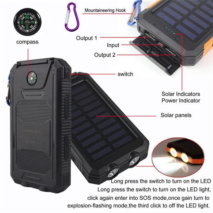 1.A powerful Solar charger with 10000mAh capacity with rugged design water-resistant yet easy to handle and fit in most pockets