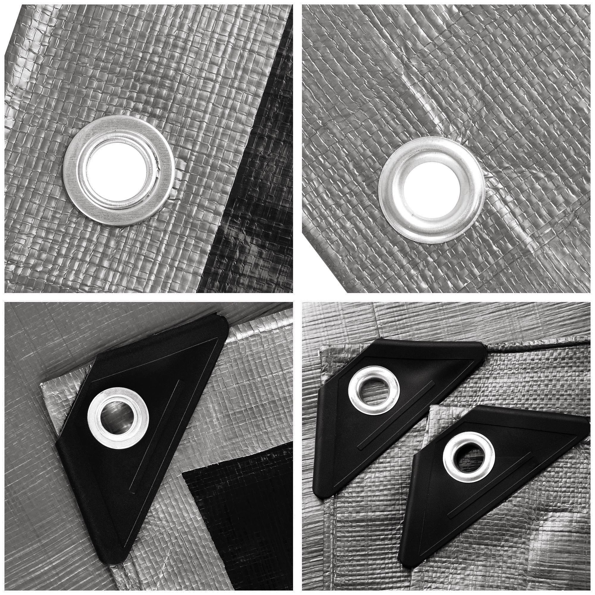 - Heavy Duty Sturdy Poly Tarp - Weights 3.73Lbs; 10mil heavy-duty thickness and aluminum grommets in 3 1/4 ft (1m) interval for better tear-resistance; PP plastics capped reinforced corners with grommets for sturdy construction; All seamless edges avoid water leakage