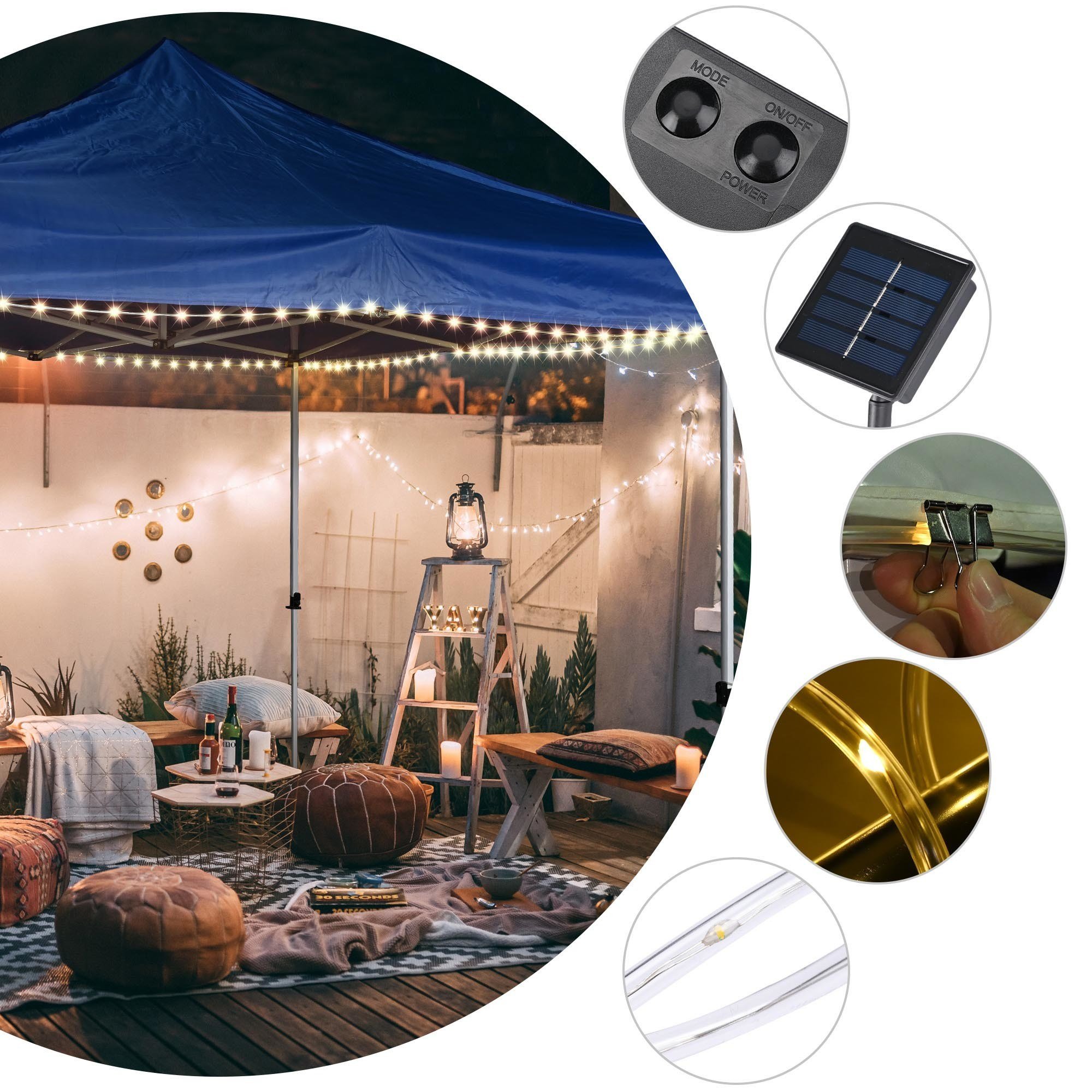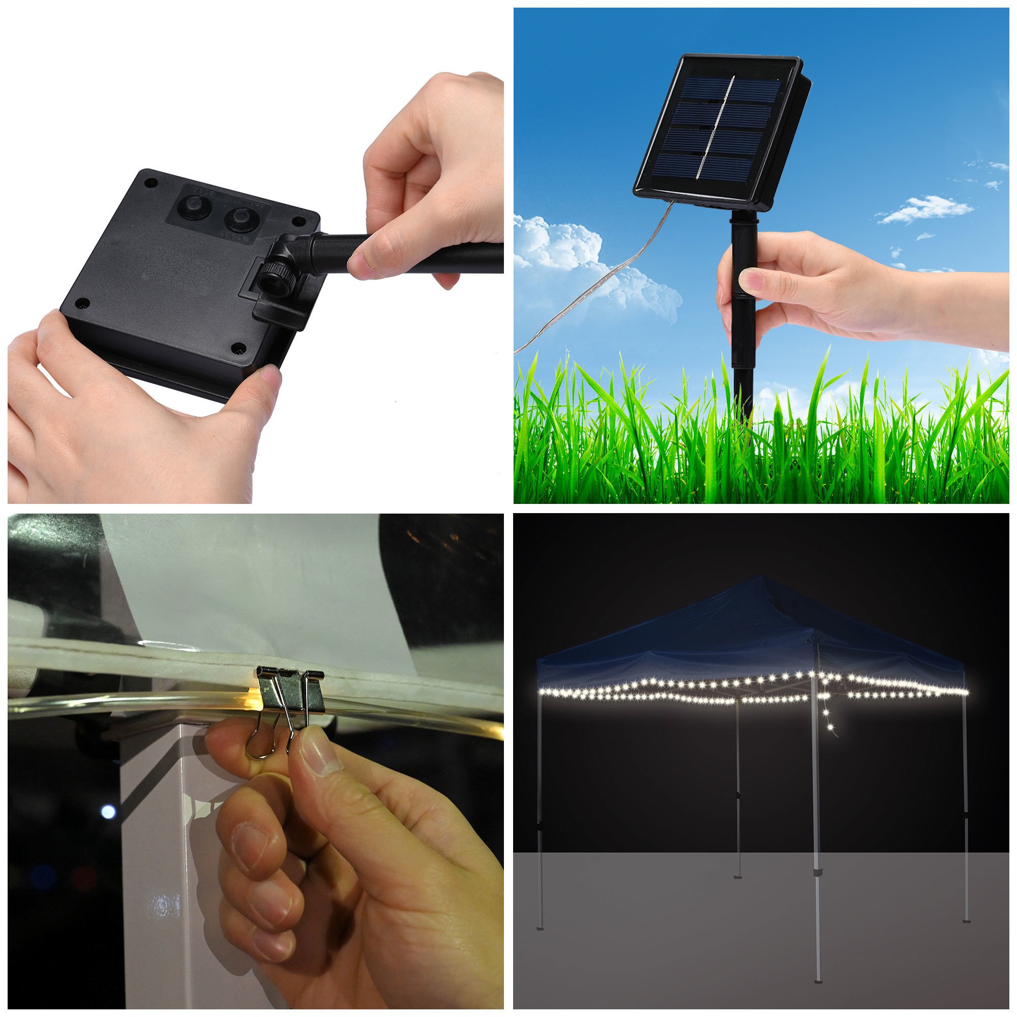 - Wide Application - 40 ft Solar Powered LED String Light fits up to 10x10 ft canopies; 120 warm white LED fairy lights to boost ambience fantastically; setting the mood for memorable night with friends & family over barbeque; wedding; tailgate party; yard; patio; beach; also perfect decoration for bicycle; Christmas tree; etc.