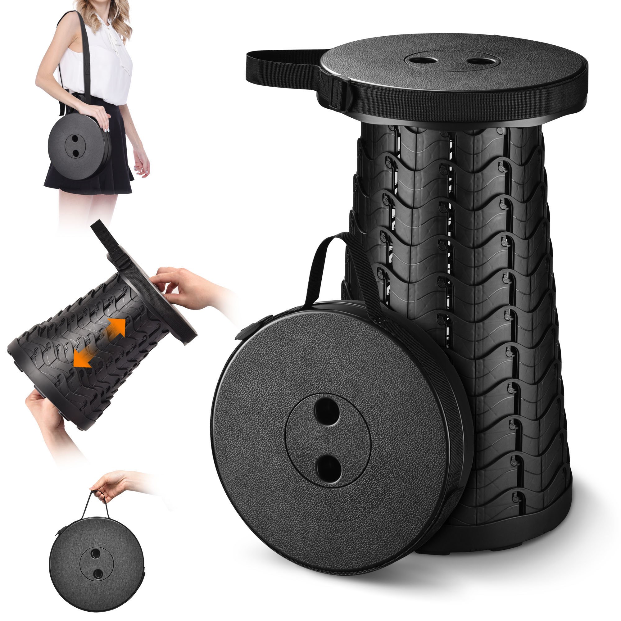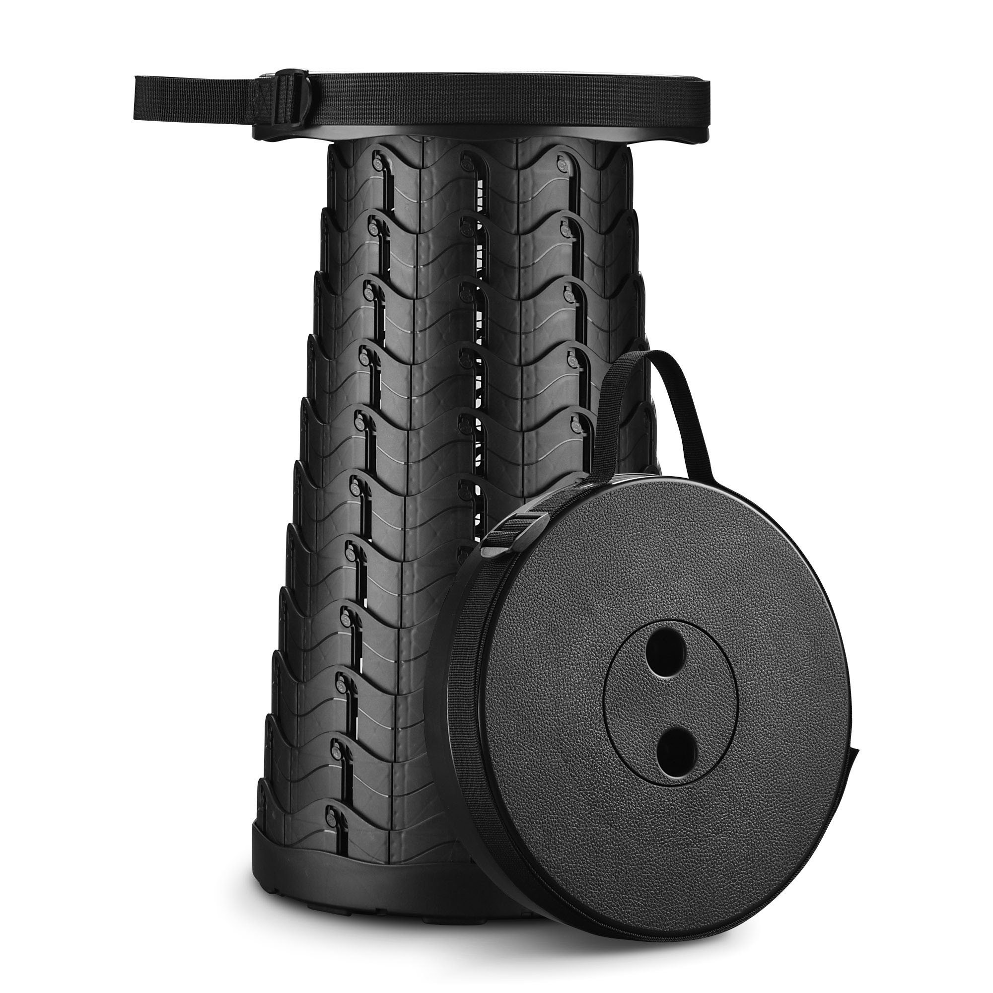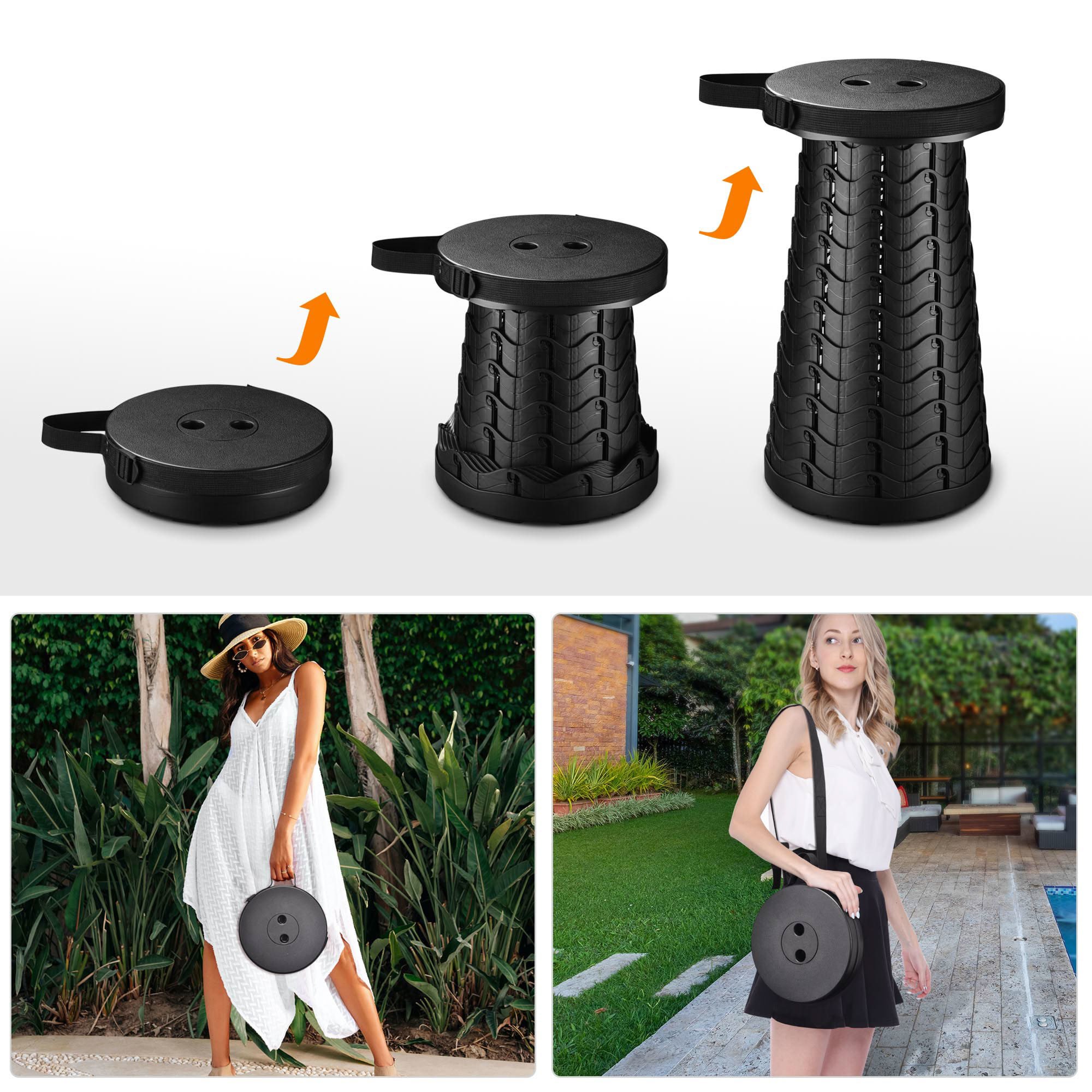 - Foldable & Portable - 9 13/16" x 9 13/16" x 17 11/16" Byootique Folding Camping Stool features a retractable design for easy folding into a 10" x 3" disc and weighs only 1.76 Lbs for portability, supporting space-saving storage in your backpack or luggage; Equipped with an adjustable strap for hand carrying and shoulder carrying for camping and travelling