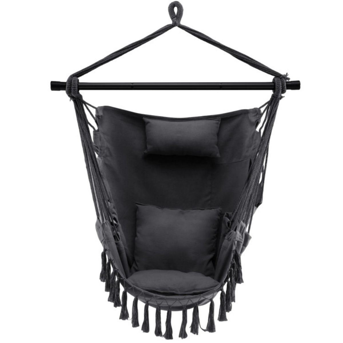 Enjoy your leisure time with this hanging rope swing chair!This comfortable hammock swing is made of durable cotton ropes and heavy duty steel bars for long term use. The grooved snap rings on each side of the bar ensure a safe and stable sitting experience. Besides, this hammock swing is paired with a soft pillow and 2 removable cushions for extra comfort. With elegant and stylish tassels, it will add charm to your indoor and outdoor places. The maximum weight capacity is 330lbs. Requires easy assembly.If you are looking for a hanging rope swing chair like this do not hesitate to place an order!Strong spreader bar with non-slip rings for safety useTightly woven cotton ropes for years of enjoymentA soft pillow and 2 cushions are provided to relieve your fatiguePortable design enables you to carry it anywhere with easeUnique tassels on the edge for more elegance and fashionPerfect for the yard, garden, patio, porch and so onThe side pocket is convenient and practicalEasy to set up with all necessary hardware