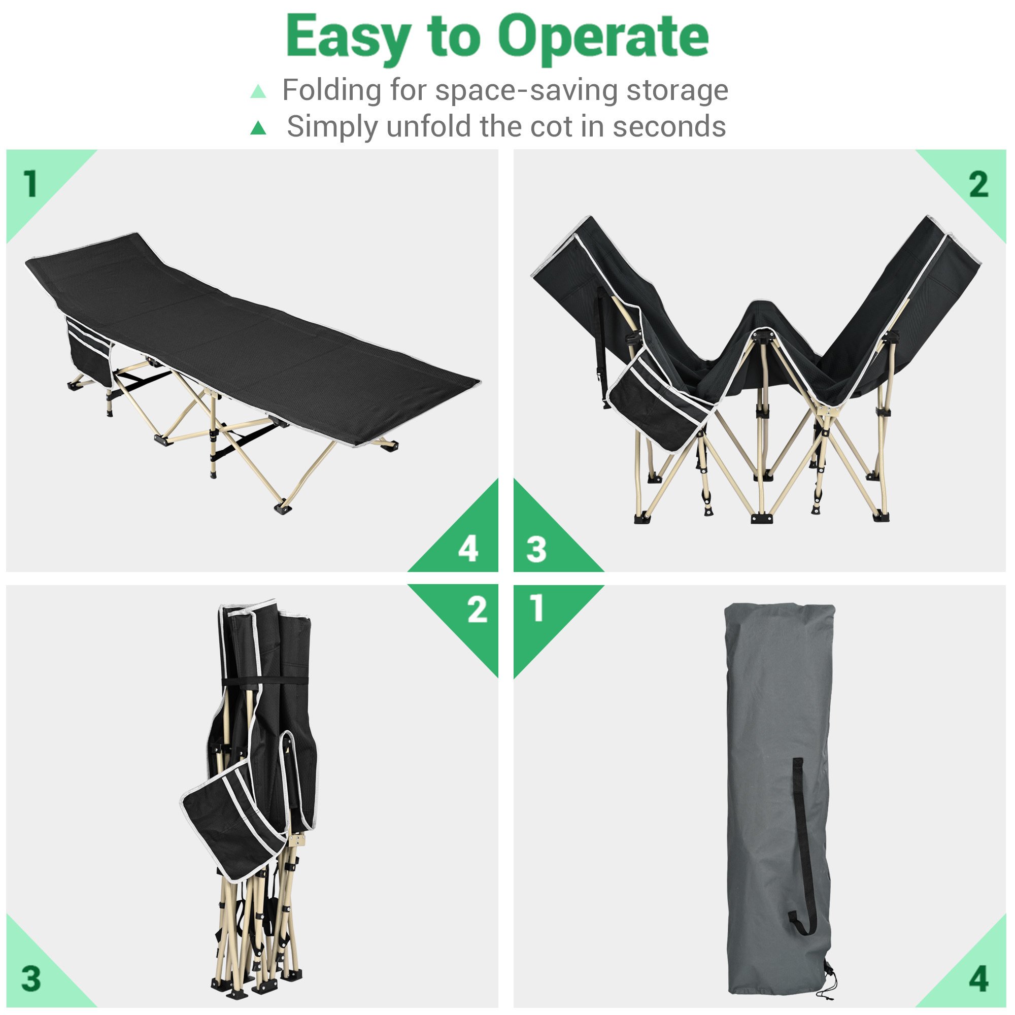 - Easy to Set up - No assembly required, simply unfold the cot in seconds to get a bed for resting, and fold it quickly after use for space-saving storage; Equipped with side pockets for holding your phone, tablet, magazine, flashlight and other essential belongings