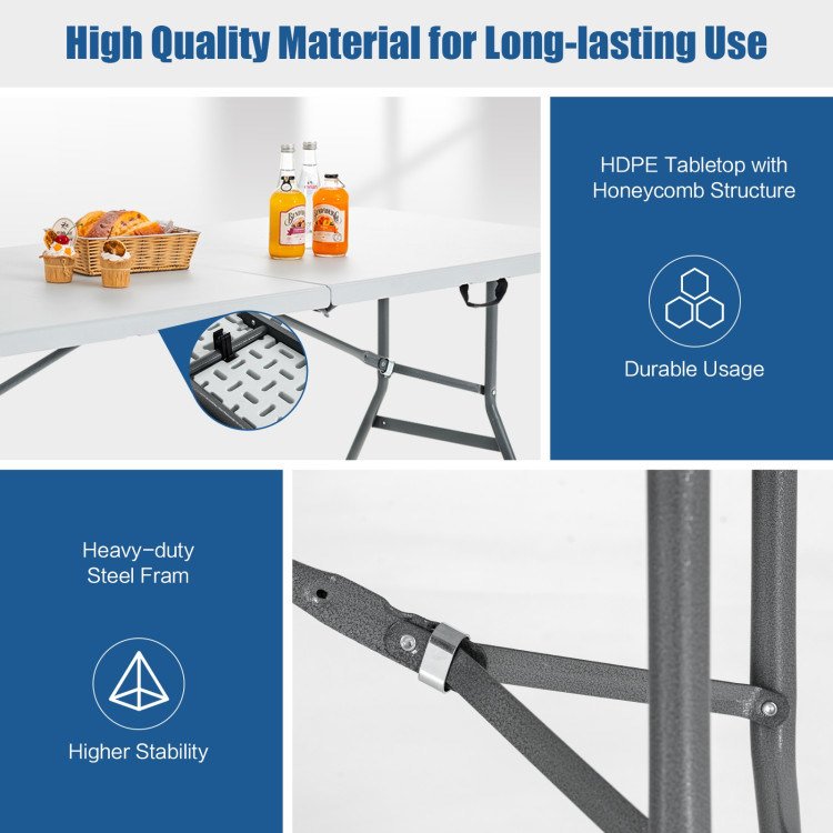 -Easy to set up; fold and carry thanks to foldable and portable design-Large tabletop for placing food; dinnerware; laptop; etc-Sturdy steel frame and honeycomb panel to hold up to 330 lbs-U-shaped frame and anti-slip footpads for extra stability-Suitable for picnic; BBQ; study; work and more-Perfect addition to backyard and poolside; dining room; office; etc-Rounded corners and smooth edges protect you from scratches-Security lock to fix the table when expanded-Smooth and waterproof surface for easy maintenance